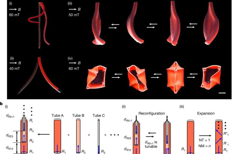 Dirigée par le professeur Metin Sitti du département d’intelligence physique de l’Académie Max Planck des sciences de l’information, en collaboration avec l’Université Koç d’Istanbul, en Turquie, l’équipe a empilé plusieurs tubes comme des poupées russes. Chaque tube contient une ou plusieurs unités magnétiques dont la distribution de magnétisation peut être préprogrammée selon les besoins. Lorsque la structure empilée des tubes est modifiée par un entraînement non magnétique, la position relative des unités magnétiques et la distribution de magnétisation de l’ensemble empilé changent en conséquence.