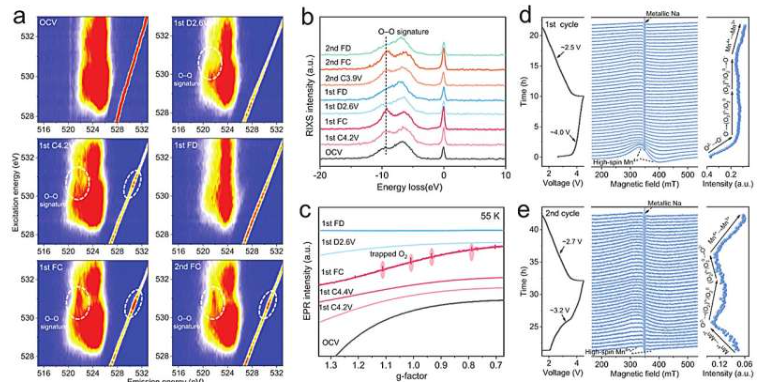 L’étude montre que, pendant la charge, le processus de conversion de l’oxygène est clair, aboutissant finalement à de l’oxygène moléculaire (O₂). Dans les cycles précoces, l’oxygène peut encore être réduit pendant la décharge, mais avec l’augmentation du nombre de cycles, de plus en plus d’O₂ est piégé dans l’état de décharge, et cette accumulation irréversible est considérée comme la cause principale de la dégradation de tension et de la perte de capacité. La technologie EPR a joué un rôle clé dans cette recherche, permettant une surveillance non destructive du comportement d’oxydoréduction de l’oxygène et révélant l’évolution et l’accumulation des intermédiaires oxygénés actifs pendant les cycles. De plus, l’EPR a révélé des changements de structure locale, avec un signal d’interaction de spin entre manganèse et oxygène oxydé s’intensifiant avec le nombre de cycles, en accord avec la formation de zones riches en manganèse et riches en lithium ; ces effets de ségrégation s’aggravent sous l’effet de l’oxygène non réduit, entraînant une dégradation des performances. En outre, l’équipe a expliqué les différences de performance entre les matériaux de positive à haute et basse teneur en sodium : les matériaux à haute teneur en sodium ont un espacement interlamellaire insuffisant, facilement affecté par la capture d’oxygène, tandis que les positives à basse teneur en sodium ont un espacement plus grand, restant stables.