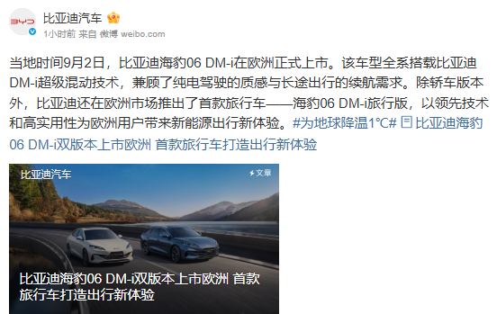 Le 5 septembre, selon le compte Weibo officiel de BYD Auto, le 2 septembre, heure locale, la BYD Seal 06 DM-i a été officiellement lancée en Europe. Ce modèle est entièrement équipé de la technologie hybride DM-i de BYD, combinant la qualité de conduite électrique pure avec les besoins d’autonomie pour les longs trajets. Outre la version berline, BYD a également introduit son premier break en Europe, la BYD Seal 06 DM-i break, offrant une technologie de pointe et une grande praticité pour une nouvelle expérience de mobilité verte aux utilisateurs européens.