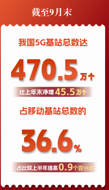 La capacité de service du réseau 5G continue de s’améliorer. Fin septembre, le nombre total de stations de base 5G atteint 4,705 millions, avec un net augmentation de 455 000 par rapport à fin d’année dernière, représentant 36,6 % du total des stations de base mobiles, en hausse de 0,9 point de pourcentage par rapport au semestre précédent.